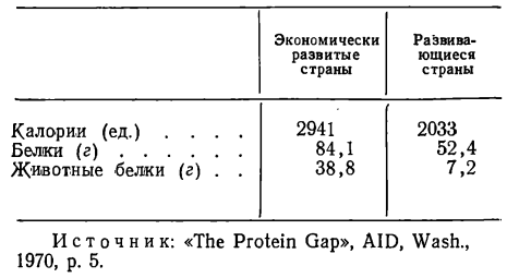 Различия в уровне потребления белков между развитыми капиталистическими странами и развивающимися странами, между народами отдельных развивающихся стран, между различными группами населения внутри этих стран все чаще выдвигаются на передний план при оценке состояния продовольственной проблемы. Дело в том, что население развивающихся стран более всего страдает от нехватки белков, то есть от так называемого белкового голода. Ресурсы продовольствия с высоким содержанием белка в развивающихся странах весьма ограниченны. Традиционные продукты с высоким содержанием белка (мясо, яйца, рыба и молочные продукты) слишком дороги для приобретения трудящимися