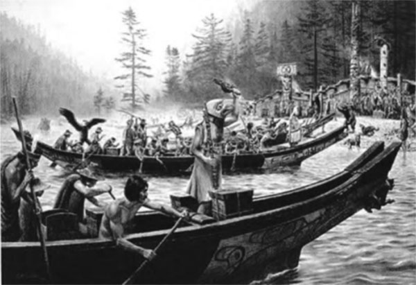 Этот институт был центром, вокруг которого сосредоточивалась вся экономическая и обрядовая деятельность индейцев. Он был известным стимулом для развития производительных сил в данном обществе, так как устройство потлача было целью каждого индейца и каждый стремился сделать свой труд наиболее производительным, чтобы скопить как можно больше богатства, которое потом щедро раздавалось на потлаче. Сущность этого своеобразного института сводилась к тому, что индеец, скопив большое по тем условиям состояние, например 40 накидок из морской выдры, 4 большие лодки, 4 шкуры бобра и 100 лыковых накидок, созывал гостей, избрав для этого любой повод (поминки, посвящение в религиозные тайны, наступление половой зрелости дочери или сына и пр.), и после угощения и плясок, длившихся три-четыре дня, раздавал гостям все свое состояние. Гостями были обычно члены рода или фратрии жены устроителя потлача...