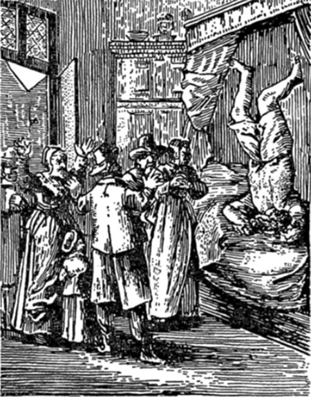больная как бы висит в воздухе, опираясь только на затылок и локти. Иногда она просто стоит на голове вверх ногами, как показано на старинном рисунке. (Рис. 30.) Затем она падает на постель, и все эти движения начинаются вновь, повторяясь по 10— 20 раз. Иногда они сопровождаются диким криком, маханием рук, судорогами лица, высовыванием языка. Сознание понемногу возвращается.