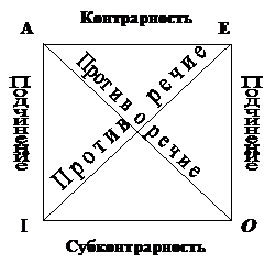 КВАДРАТ ЛОГИЧЕСКИЙ (квадрат противоположностей) был предложен Михаилом Пселлом (11 век). Служит в качестве мнемонического приема для запоминания отношений между четырьмя основными видами суждений аристотелевской логики. Имеет вид диаграммы, на которой наглядно показаны эти отношения. Буквы А, Е, I , О символизируют соответственно общеутвердительное, общеотрицательное, частноутвердительное и частноотрицательное суждения.